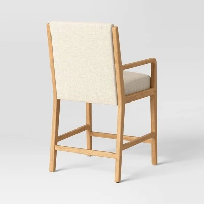 Transform your home bar or workspace with these 2-Piece Knock Down Esters Armed Counter-Height Bar Stools from Threshold™. This set of upholstered bar stools includes a pair of fixed-height stools built on a wooden frame, paired with soft, padded seats and backrests for comfortable seating. The armed bar stools with light brown wooden frames and cream-textured upholstery create an eye-catching contrast that looks great placed anywhere, while the square legs and footrests keep them standing properly poised.