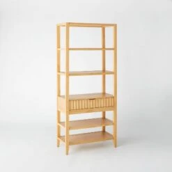 The 72-Inch Thousand Oaks Bookcase from Threshold™ designed with Studio McGee makes an elegant addition to your home or office. Made with wood in a natural finish, this five-shelf bookcase offers plenty of space to organize and showcase your collection of books, photo frames and other decorative items. The built-in drawer helps keep the items you want to keep out of sight stowed away, while the open shelves provide easy access. Offering easy integration into a wide variety of decor styles, this natural-shade bookcase fits perfectly along the wall in your living room, office or any other area.
