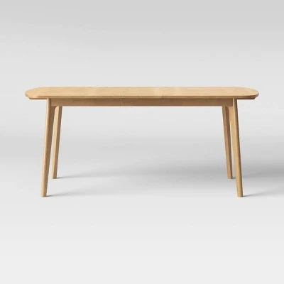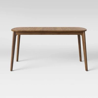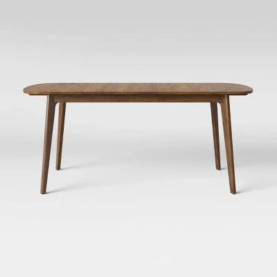 Gather with loved ones around a meal placed out on the Astrid Mid-Century Dining Table with Extension Leaf from Threshold™. Whether you’re having a nightly dinner with the family or inviting guests, this wood dining table can fit them all with the extension leaf offering extra table space. The rounded edges and gently sloping four-point legs offer an easy look that will blend in with the rest of your decor for an effortless aesthetic.