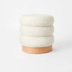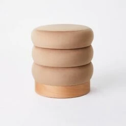 This Clarkdale Channel Tufted Ottoman with Wood Base (FA) from Threshold™ designed with Studio McGee anchors your space in chic style, from your living room or reading room to your dining area. Set atop a wood-finish round base, this ottoman is upholstered in a solid-colored fabric with a padded top and channel-tufted outer sides that resemble a three-tiered silhouette for added visual and textural appeal. The upholstered ottoman is ideal for placing in front of a sofa to prop up your feet after a long day at work, or for using as additional seating or as a makeshift coffee table or end table.