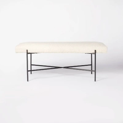 Give your home a classic sense of style with the Clarkston Metal Base Upholstered Bench Cream Boucle from Threshold™ designed with Studio McGee. The cream colored boucle design of this bench makes it a perfect understated yet beautiful addition to your space. The textured upholstery adds subtle texture, and the black metal legs create a timeless look that uplifts the sophistication of your space. The high contrast design elements add a touch of boldness, while still being delicate enough to highlight other furniture or accent decor. The neutral colors and textures work perfectly with a variety of design themes and elements. This bench works well as a centerpiece in a living room or an accent piece in a bed space.
