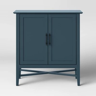 Add versatile storage to your space with this Elloree Storage Cabinet from Threshold™. Designed in a navy hue with sleek black handles, this decorative storage cabinet creates a sophisticated look in your home office or living room space. The spacious tabletop provides you a dedicated area for decorative display, while the two doors on front conceal the storage space to keep the clutter out of sight. Perfect to store everything from extra blankets and throws to safekeeping your favorite reads, this storage cabinet brings function and style to any space.