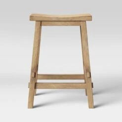 Enhance the look of any counter, high-top dining table or home pub with the functional simplicity of the Halifax Farmhouse Wood Counter Stool from Threshold™. This 23.81-inch stool is constructed from solid, sturdy hardwood in a distressed finish, lending your space a touch of country-chic charm. It stands on four flared, square legs with foot rails for better stability, and is topped off with a curved seat for enhanced comfort and style. Plus, the backless and armless design offers a space-saving seating solution to any room.