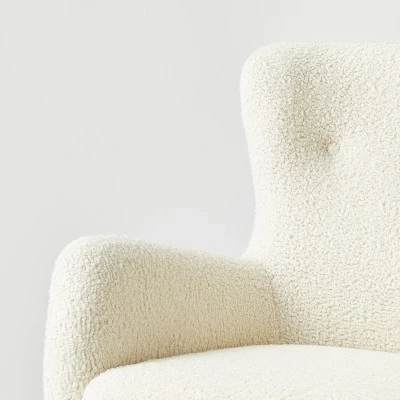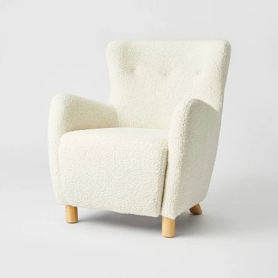 Refresh your seating ensemble with the luxurious style of the Kessler Wingback Accent Chair in Cream Sherpa from Threshold™ designed with Studio McGee. Covered with faux-shearling upholstery, this cream accent chair boasts a wingback style with tufted detailing for added charm. The wooden legs complement the upholstery and add to the look. Use this upholstered chair to add seating to your living room or any other area of your home.