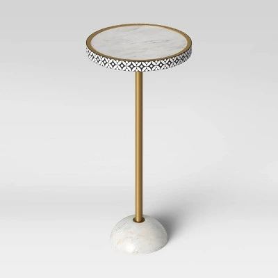 The Leonia Round Marble Drink Table from Threshold™ will add a unique accent to your space. Featuring a sleek marble top set on a metal pedestal base, this mixed-materials table is sure to bring chic shine and one-of-a-kind style to your home. The round marble top is perfect for placing a drink or decorative piece, and the beautiful patterned accents on the edge of the tabletop add a touch of artsy flair to your decor.