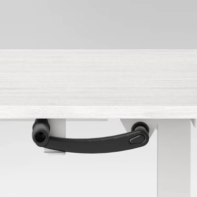 Give your workstation a modern upgrade with this Loring Manual Height-Adjustable Standing Desk from Threshold™. This mixed-material standing desk provides your room a stylish look with its distinctive, clean-lined form of a black metal base and a light-brown surface with a woodgrain appearance. It has a manual adjustable-height design to help you find the right height for maximum output, topped with a spacious desktop that provides a perfect platform for your laptop and accessories.
