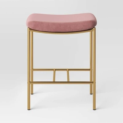 Bring a touch of modern glam to your bar seating with this Orion Luxe Backless Counter Height Bar Stool with Brass Legs from Threshold™. This backless counter-height bar stool makes a stylish addition to your living space. Upholstered in blush pink velvet fabric with a rectangular padded seat, it pairs elegantly with your bar setting, and creates a comfy sitting experience. The gold-tone brass frame adds luxe appeal, and the built-in footrails offer better balance.