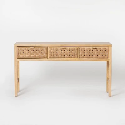 Design a stunning coastal look in your entryway, living room or other area of your home with the Palmdale Woven Drawer Console Table from Threshold™ designed with Studio McGee. This rectangular console table provides a perfect shape and easy organization for a variety of rooms, while also offering convenient storage in its lovely woven drawers. The poplar frame and MDF tabletop are finished in a warm neutral beige wood for versatile styling with many upholstery textures and color palettes, while the unique wooden drawer pulls add just a hint of vintage style to the look.
