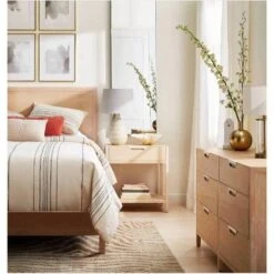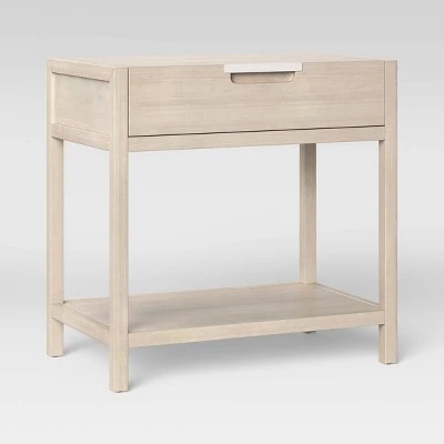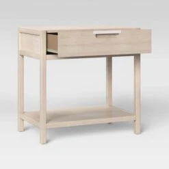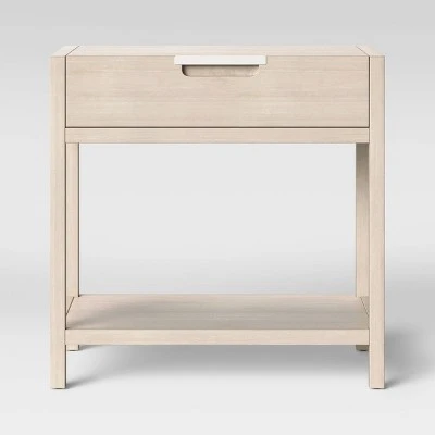 Add subtle, minimalist appeal to your master suite or guest bedroom with this Porto Nightstand with Drawer from Threshold™. Clean lines and natural tones lend understated style to this rectangular nightstand, giving your room a modern feel you’re sure to love. This wood-frame nightstand is designed with a pull-out drawer, great for phone chargers, reading glasses and more, while an open shelf at the bottom is perfect for books and electronics. Plus, the rectangular top offers an ideal surface for anything from table lamps to potted plants — making this nightstand a practical and aesthetically appealing option you’ll appreciate.