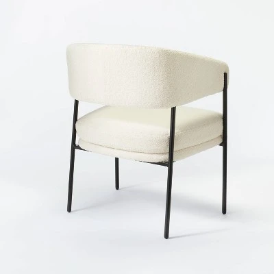Create an inviting look in your home with the chic style of this Rosemead Metal Frame and Rounded Back Accent Chair from Threshold™ designed with Studio McGee. Standing on four sleek metal legs, this accent chair features a rounded back with sherpa-like upholstery on the seat and back for a touch of modern style. Designed to suit a variety of decor styles, this cream accent chair works well in your living room, study area or any other space to enjoy a comfortable sitting.
