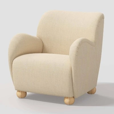 Switch up your home decor with this Rumi Armchair in Linen from Threshold™. This upholstered armchair chair features a modern appearance with a thick padded seat and backrest for comfortable sitting. Covered in solid-colored linen fabric, it blends seamlessly with the existing decor in your home, and the pinewood frame and round wooden legs offer sturdy support. Place it in your living room, bedroom or guest room to instantly elevate your decor.