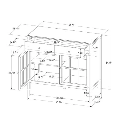 The Windham 2 Door Accent Buffet, Cabinet with Shelves from Threshold™ brings a pop of color to your home so you can make a statement while storing household items. This attractive accent cabinet has both cupboard and drawer storage options, for items you want to display or keep out of sight. The two doors with glass panes protect your items while still allowing them to be on display. Recommend two people for assembly. Expect around one hour for assembly with clear directions.