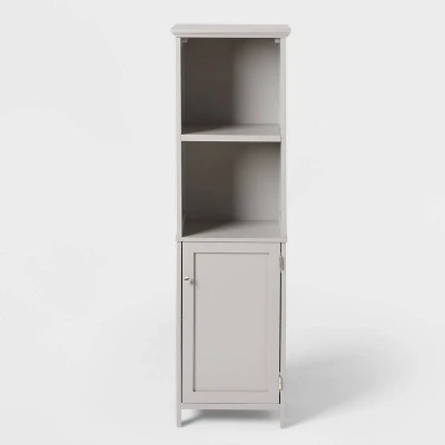 Add more storage to your bathroom with this Over the Toilet Wood Linen Tower from Threshold™. This space-saving storage tower is designed to fit over most standard toilets. It showcases a gray wooden finish that coordinates easily with any decor. The upper double door cabinet and a single open shelf provide enough space to store and display your bath items and essentials. Pair with other pieces in the same collection to complete the cohesive look.