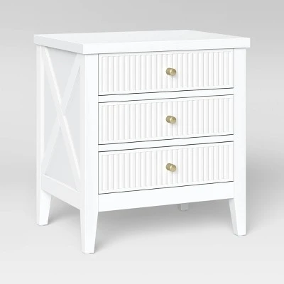 This Wrentham Beadboard Farmhouse 3-Drawer Nightstand from Threshold™ is an ideal combination of both style and functionality. Highlighted by self grooving, stylish X detailing on the sides and elegant metal knobs for easy pulling, this space-saving bedside table offers a delightful chic look to your bedroom decor. The sturdy wood construction offers strength and durability, while the three drawers and a spacious tabletop provide plenty of storage for your go-to essentials.